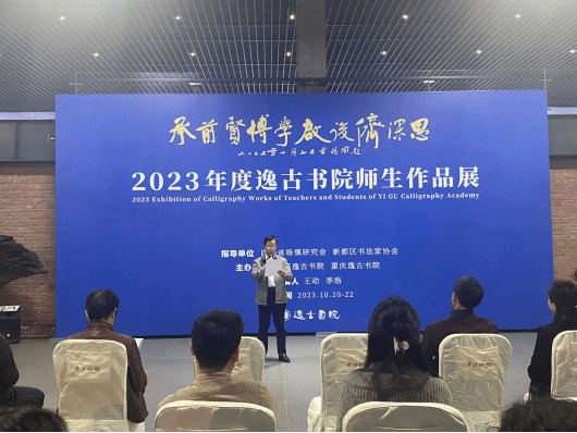 10月20日,金秋送爽,丹桂飘香。宜宾学院教育学部教授、宜宾长江画院院长曾德宏与宜宾学院教育学部青年教师丁友鹏,应邀前往大学士杨升庵的故乡新都香迪红馆,参加四川省杨慎研究会、新都区书法家协会指导的“承前贤博学·启后侪深思”2023年度逸古书院师生作品展览的开幕式,见证2023年度逸古书院师生书法研习的阶段性成果。本次展览邀请省书协、各区书协、各高校教师20余位艺术家精心创作的“杨升庵”主题书法作品,学生80余件作品,共计展出100余件作品。展览由逸古书院校长李浩、逸古书院创始人王动策划,开幕式由王动主持,曾德宏教授致贺词,周家学主席宣布开幕。当天到场嘉宾还有林峤主席、丁友鹏、雷杰、杨阳、陆峰、王建平等艺术家。