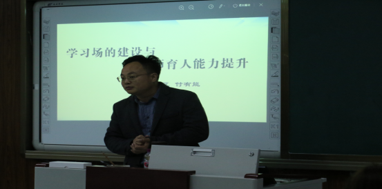 付有能以播放视频《张晓凤:我交给你一个孩子》引入讲座主题,其讲座内容分为三个部分:一是系统介绍学习的类型及其过程,提出学习从不同维度可分为独立学习与交往学习、外向学习与反思学习、经验学习与符号学习等种类,从学习主体、内容、目标、手段、方式、方法、时间、空间、效果等方面对学习过程进行理解阐释;二是分析讲解学习场的理解与构建,认为学习场主要有立场、在场、场景与场域四种类型,并就如何正解理解与积极建构问题发表了自己见解;三是深入阐述教师育人能力的提升,特别强调了教师自我修炼之道,提出教师要注重课堂变革,要增强精神感召力,要积极深入开展教育研究。最后,付有能与听讲座学生就相关问题进行了充分互动交流。